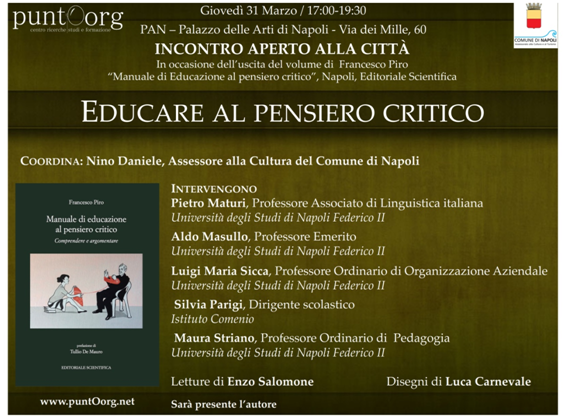 Il giorno 31 marzo alle ore 17.00,  presso il PAN | Palazzo delle Arti di Napoli, si terrà un incontro sul tema "Educare al pensiero critico". L'incontro nasce in occasione della nuova stampa del libro di Francesco Piro (Università degli Studi di Salerno) "Manuale di educazione al pensiero critico", Editoriale Scientifica, Napoli 2016, mirando a focalizzare il problema generale dell'uso delle esercizio delle capacità critiche, della formazione scolastica al pensiero critico, dell'uso del pensiero critico nella vita civile. Ne discuteranno il filosofo Aldo Masullo, lo studioso di linguistica Pietro Maturi, lo studioso di economia Luigi Maria Sicca, la studiosa di pedagogia Maura Striano, la dirigente scolastica Silvia Parigi. Passi del libro saranno letti da Enzo Salomone. Sarà presente l'autore.