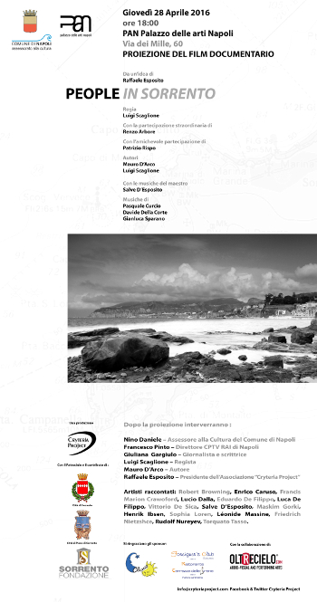 Da un'idea originale di Raffaele Esposito, presidente dell'Associazione Cultura "Cryteria Project" (che opera da anni per la promozione culturale in Penisola Sorrentina), elaborata dagli autori Mauro D'Arco e Luigi Scaglione, nasce il documentario "People in Sorrento", per la regia dello stesso Scaglione. Il film documentario sarà proiettato alle 18:00 (con ingresso gratuito) di giovedì 28 Aprile, a Napoli, al PAN (Palazzo delle Arti Napoli) in Via dei Mille 60.