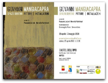 E' stata inaugurata sabato 23 aprile alle ore 17.30, presso le Sale delle Terrazze di Castel dell'Ovo la mostra personale dell'artista napoletano Giovanni Mangiacapra "Spazio dentro": in esposizione oltre 50 opere ed alcune installazioni, in cui la materia (specialmente carta e cartone, oltre a materiale di riciclo) dialoga con lo spazio della superficie e del luogo, cercando, al di là di limiti ed apparenze, prospettive possibili ed immaginarie. La pittura di Giovanni Mangiacapra è concepita come scoperta e sperimentazione, generata da graffiante critica, narrativa e poetica, di meditazione e di azione, stacchi sui generis, di sguardo, gesto e colore. Un immaginario confluire di amore e pathos, messi in bella evidenza in tutta la loro magnificenza, che appunto il titolo sottolinea,