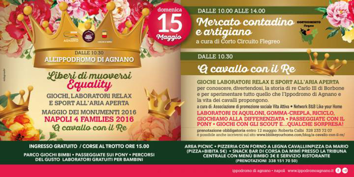 Domenica 15 maggio all'ippodromo di Agnano (ingresso gratuito dalle ore 10.30) con tante attività nel parco per la famiglia. A cominciare dal "Mercato Contadino e Artigiano" a cura di Corto Circuito Flegreo. Oltre all'artigianato locale, si troverà frutta e verdura di stagione, formaggi di capra e di pecora, zuppe contadine, dolci vegani, pani e farine da grani antichi, olio d'oliva e vino, autoprodotto e certificato dal Sistema di Garanzia partecipato.  E ancora, l'associazione Vita Attiva organizza "A cavallo con il Re" iniziativa che prevede: giochi all'aria aperta e laboratori di aquiloni, della gomma crepla, del riciclo e della differenziata "dove lo metto quest'oggetto" con la partecipazione dell'Asìa; e ancora letture e racconti racconti di Re Carlo III di Borbone, percorsi con il pony. Le attività sono rivolte ai bambini dai 4 ai 14 anni anche diversamente abili.