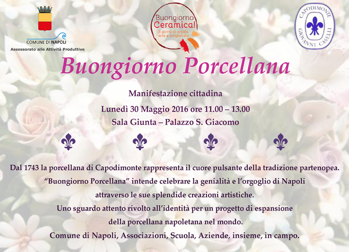 L'Assessorato alle Attività Produttive del Comune di Napoli ha organizzato per il giorno lunedì 30 maggio 2016 una manifestazione cittadina dedicata alla celebrazione della genialità e dell'orgoglio napoletano legato alla lavorazione della Porcellana di Capodimonte, dal titolo "Buongiorno Porcellana". Dal 1743 la porcellana di Capodimonte rappresenta, infatti, il cuore pulsante della tradizione artistica partenopea. In questo incontro, il Comune di Napoli, le Associazioni di categoria, le scuole e le aziende scendono in campo, non solo, per focalizzare lo sguardo sull'identità storica e culturale di quest'arte locale, ma soprattutto per delinearne insieme un progetto di espansione nel resto del mondo. |