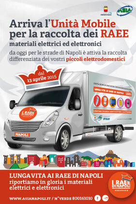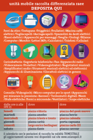 E' partito lo scorso 13 aprile il progetto sperimentale di raccolta itinerante dei RAEE (rifiuti elettronici) organizzato dal Comune e ASIA nei quartieri del centro storico di Napoli e destinato ad incrementare e favorire la raccolta sul territorio dei piccoli elettrodomestici, Tv, Monitor e Sorgenti luminose. Il servizio di raccolta dei RAEE sarà attivo dal lunedì al sabato, dalle ore 09:00 alle ore 13:00secondo lo specifico calendario di seguito riportato: