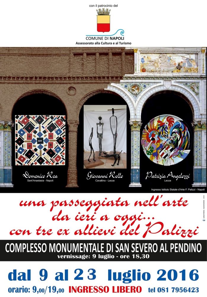 "... una passeggiata nell'arte da ieri ad oggi...Con tre ex allievi del Palizzi"; due artisti "Salentini", Patrizia Angelozzi ceramista e Giovanni Rollo scultore polimaterico, insieme a Domenico Rea, valente pittore napoletano, dopo aver scoperto di avere in comune la passione per l'arte, di aver frequentato da studenti l'Istituto d'Arte "F. Palizzi" di questa città, danno luogo a questo evento unico e straordinario. Tale incontro serve, a rievocare le loro radici formative ea presentare alcuni dei momenti più significativi della loro personale attività sviluppatasi nel corso degli anni e non priva di grandi soddisfazioni e riconoscimenti. Possiamo dire che questa mostra racchiude in se tre momenti diversi: "nostalgia di gioventù", un momento di antologica personale e una riflessione sui risultati raggiunti."