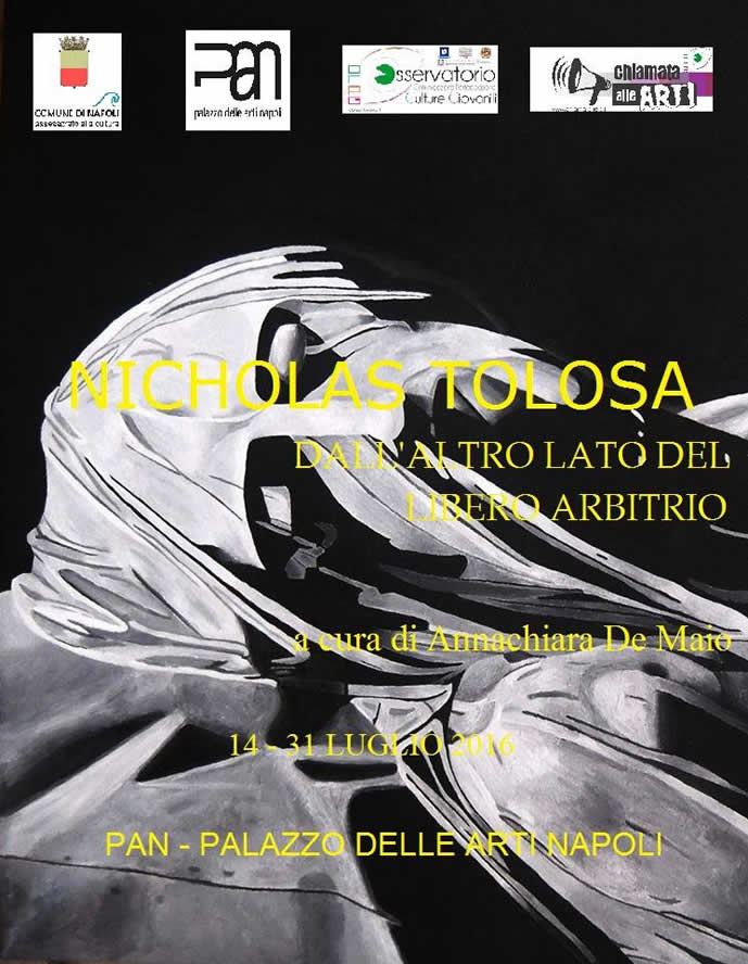 Giovedì 14 Luglio 2016, presso il PAN, a Napoli, in via dei Mille 60, si inaugura alle 17,30 una mostra personale d'Arte contemporanea di Nicholas Tolosa con il patrocinio morale dell'Assessorato alla Cultura e al Turismo del Comune di Napoli e dell' Osservatorio Comunicazione Partecipazione Culture Giovanili (OCPG) dell' Università di Salerno con il contributo critico di Annachiara De Maio, intitolata: "Dall' altro lato del libero arbitrio". La mostra raccoglie una selezione di opere, tra le più recenti dell'artista, scelte con lo scopo di metterci di fronte alle conseguenze generate dal libero arbitrio, l'ancestrale scelta a cui siamo chiamati a rispondere, la scelta tra il bene e il male. |