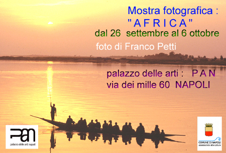 Dal 26 Settembre 2016 sarà aperta al pubblico la mostra Franco Petti. Fotografie dell'Africa presso la Galleria Pan (Palazzo delle Arti) di Napoli. L'esposizione, promossa e prodotta dal Comune di Napoli, curata dall'Uffcio Stampa Giuseppe De Pietro in collaborazione con l'Archivio De Pietro Press, sarà presentata nell'ambito di Conoscere l'Africa, un progetto della De Pietro Press Communication di Roma. Resterà aperta fino al 6 ottobre.
