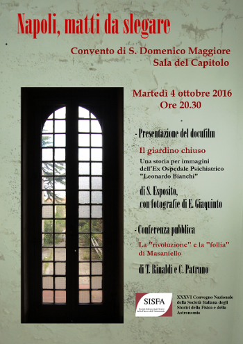 Nel corso della serata: presentazione del docufilm "Il giardino chiuso" - Una storia per immagini dell'Ex-Ospedale Psichiatrico "Leonardo Bianchi", di S. Esposito, con fotografie di E. Giaquinto; conferenza pubblica su "La 'rivoluzione' e la 'follia' di Masaniello", di T. Rinaldi e C. Patruno.