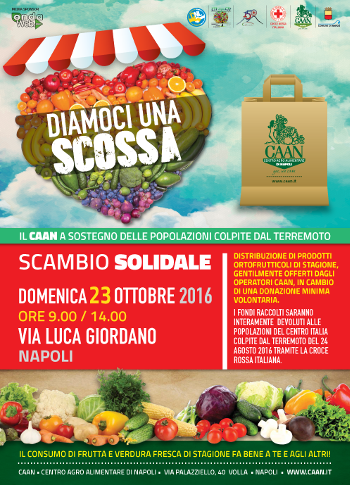 Uno scambio solidale. Un'occasione per raccogliere fondi da destinare alle popolazioni del Centro Italia colpite dal terremoto dell'agosto scorso, ma anche per far conoscere all'opinione pubblica la più grande cittadella agroalimentare del Mezzogiorno di Italia e la qualità dei suoi prodotti. Domenica 23 ottobre, dalle ore 9 alle 14, presso l'area pedonale di via Luca Giordano, a Napoli, il CAAN allestirà dei gazebo per la distribuzione di kit di frutta e verdura di stagione - gentilmente offerti dagli Operatori del Settore Ortofrutticolo - dietro un'offerta minima volontaria che sarà interamente devoluta alla Croce Rossa Italiana per sostenere le popolazioni terremotate. "All'indomani del terribile sisma che lo scorso 24 agosto ha raso al suolo intere cittadine del Centro Italia - racconta il giovane presidente CAAN Carmine Giordano - in tantissimi dei nostri imprenditori ci hanno manifestato l'intenzione di dare un contributo concreto alle popolazioni colpite. Il CAAN si è allora fatto promotore di una serie di contatti con la Croce Rossa e l'Assessorato al Lavoro del Comune di Napoli per concordare le strategie di intervento più idonee". "Il Comune di Napoli è da sempre in prima linea nel promuovere azioni benefiche e solidali verso i più bisognosi - dichiara l'Assessore al Lavoro e alle Attività Produttive, Enrico Panini - Diamoci una Scossa è una nuova importante iniziativa di beneficenza che abbiamo promosso per sostenere, insieme al contributo attivo dei cittadini della nostra città, le popolazioni dell'Italia centrale colpite dai terremoti dello scorso agosto. Ringraziamo il CAAN per aver ideato e messo in moto questa macchina solidale". Nasce così l'evento "Diamoci una scossa", organizzato dal Centro Agro Alimentare in collaborazione con la Cooperativa Napoli Libera, il Consorzio Terre Italiane e la Croce Rossa Italiana. L'iniziativa ha ottenuto anche il patrocinio morale del Comune di Napoli e il sindaco Luigi de Magistris raggiungerà via Luca Giordano alle 11 per testimoniare in prima persona il sostegno all'evento e, più in generale, quanto l'Amministrazione comunale creda nell'importanza strategica della partecipata CAAN per la valorizzazione delle eccellenze produttive locali e per garantire l'adeguata tracciabilità a tutta la filiera agroalimentare. |