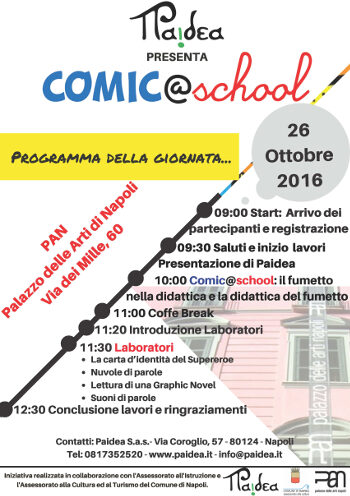Mercoledì 26 ottobre dalle 9 alle 13 si terrà presso la sala De Stefano del PAN - Palazzo delle Arti di Napoli l'evento di presentazione di Comic@school, iniziativa realizzata da Paidea sas in collaborazione con l'Assessorato all'Istruzione e l'Assessorato alla Cultura ed al Turismo del Comune di Napoli. Paidea nasce a giugno del 2016 nel coworking di Città della Scienza con tre priorità: innovare, formare e progettare. Gli obiettivi prefissati sono la promozione e la valorizzazione della didattica attraverso iniziative partecipate finalizzate all'attivazione sociale mediante la creazione di un network sinergico tra tutte le realtà attive sul territorio. Da queste premesse nasce Comic@school che propone il fumetto come nuovo strumento didattico e segue due filoni: 1. Il fumetto nella didattica come strumento 2. La didattica del fumetto come fine educativo L'evento ha l'obiettivo di: - presentare Comic@school a Dirigenti, docenti e studenti -stimolare il confronto su un'innovativa metodologia didattica - applicare praticamente le potenzialità intrinseche nel fumetto. |