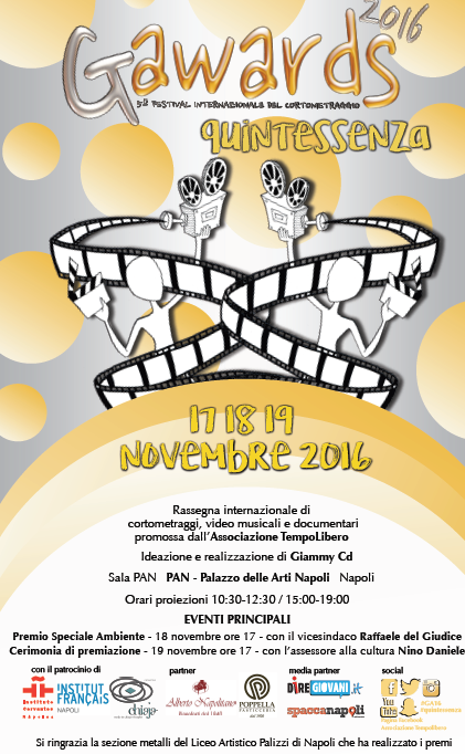 L'associazione TempoLibero, presieduta da Clorinda Irace, nell'ambito delle sue attività volte al sostegno del mondo giovanile, promuove la manifestazione G AWARDS 2016. G Awards è un progetto che nasce dall'iniziativa di un giovanissimo socio junior dell'Associazione TempoLibero, Giammarco Caccese, uno studente liceale napoletano che da cinque anni a questa parte promuove questo premio cinematografico utilizzando web e social network per diffondere la competizione che quest'anno vede coinvolti video e corti provenienti anche da Stati Uniti e Giappone. |