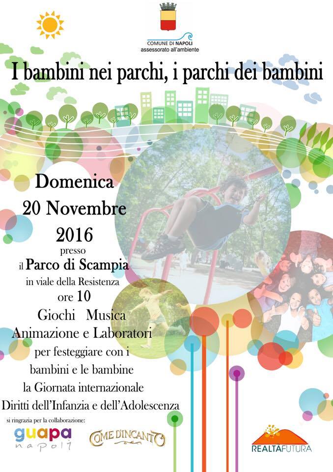 Domenica 20 novembre a partire dalle ore 10 nel Parco di Scampia (ingresso Viale della Resistenza) si svolgerà la manifestazione "I bambini nei parchi, i parchi dei bambini" sorta per festeggiare con i bambini e le bambine della città la Giornata Internazionale dei diritti dell'infanzia e dell'adolescenza.
