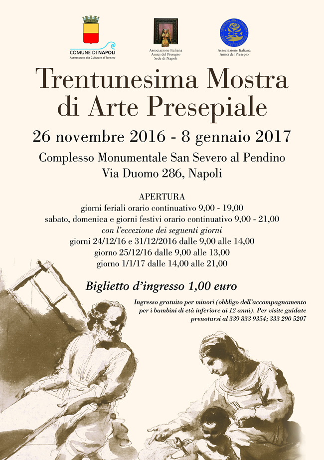 Fino all'8 gennaio nella suggestiva cornice di San Severo al Pendino la XXXI Mostra d'Arte Presepiale che l'Associazione Italiana Amici del Presepio sede di Napoli, presenta al fine di mantenere viva la tradizione del presepio.