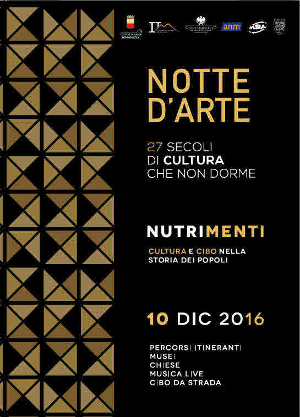 La Notte d'arte 2016, prevista sabato 10 dicembre dal titolo "NutriMenti cultura e cibo nella storia dei popoli", ha come da tradizione un duplice obiettivo: la divulgazione dell'arte e della tradizione napoletana e l'affermazione della cultura sotto l'aspetto di solidarietà e vicinanza tra i popoli.