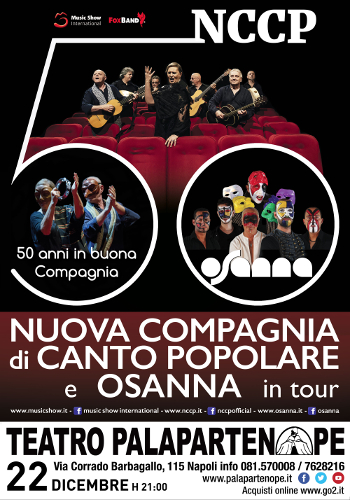 E' partito il 29 novembre dall'Auditorium di Milano il tour "50 anni in Buona Compagnia", con cui la NCCP - Nuova Compagnia di Canto Popolare presenta per la prima volta dal vivo il suo nuovo doppio album, intrecciando il proprio percorso live con ospiti d'eccezione, gli Osanna di Lino Vairetti, storica band del migliore prog rock italiano, in rappresentanza della 'Buona Compagnia'. I due gruppi saranno a Napoli, al Palapartenope il 22 dicembre ore 21.00 per un grande concerto patrocinato dall'Assessorato alla Cultura del Comune di Napoli, dopo essersi incontrati sui palchi dei maggiori teatri nazionali. E' prevista la partecipazione a sorpresa di numerosi altri ospiti.