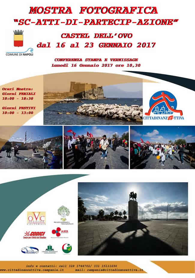 Il 16 gennaio 2017 prende il via la mostra fotografica "Sc-atti-di-partecip-azione", fase finale del concorso fotografico internazionale ideato dall'associazione Cittadinanzattiva Campania Onlus. La conferenza stampa si terrà alle ore 10:30 nelle Sale delle Terrazze del Castel dell'Ovo di Napoli e sarà seguita dall'inaugurazione della mostra, accompagnata da un buffet di benvenuto.