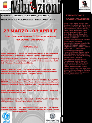 Il prossimo 23 marzo 2017, alle ore 17,30, presso la prestigiosa location del Complesso Monumentale di S. Severo al Pendino, in Napoli, alla via Duomo n. 286, si inaugura la terza tappa di "Vibrazioni" Festival itinerante d'arte contemporanea, cultura, benessere e solidarietà a sostegno delle iniziative umanitarie Unicef Campania - 2° edizione.