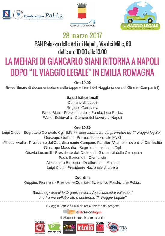 Il giorno 28 marzo nell'Atrio del Pan, al termine del viaggio Legale, che ha visto protagonista la Mehari di Giancarlo Siani in un percorso di legalità nelle principali città dell'Emilia Romagna, si terrà un evento finale con la partecipazione dei rappresentanti istituzionali, sociali e del mondo dell'informazione, nonché del Presidente Nazionale di Libera, don Luigi Ciotti.