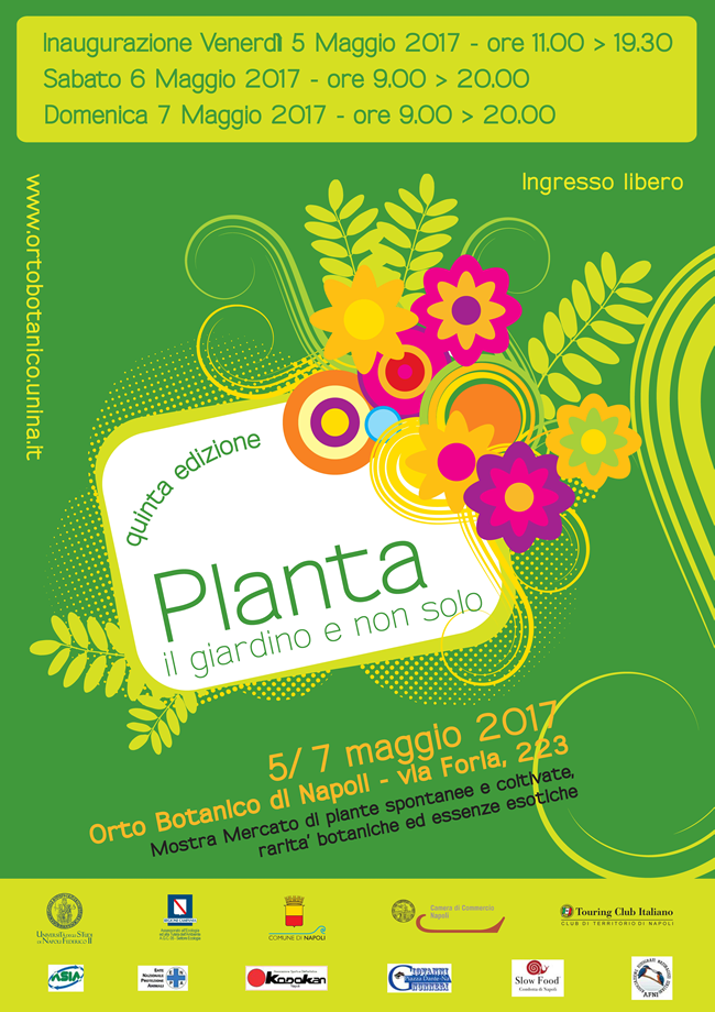 L'Orto Botanico dell'Università degli studi di Napoli è lieto di annunciare la V edizione di "Planta, il giardino e non solo", Mostra Mercato di piante spontanee e coltivate, rarità botaniche ed essenze esotiche. Un ampio settore della Mostra sarà dedicato all'esposizione e vendita di prodotti alimentari di origine naturale. L'evento si terrà presso gli spazi dei viali dell'Orto Botanico nei giorni 5, 6 e 7 Maggio-2017. Performance musicali ed artistiche, laboratori didattici e del gusto accompagneranno l'intera manifestazione.