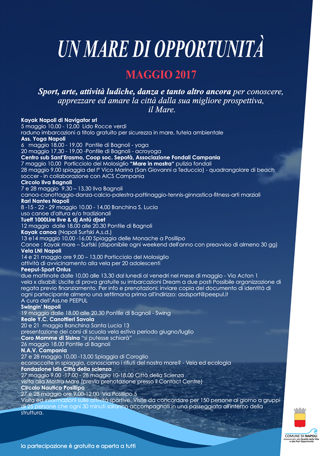 L'iniziativa è un'anticipazione del "Mese del Mare" previsto a ottobre, e un corollario alla bellezza e all'importanza delle iniziative per Maggio: per tutto il periodo, a napoletani e turisti sarà gratuitamente offerta la possibilità di scoprire le attività dei circoli nautici, delle associazioni, e delle federazioni sportive che organizzeranno degli open day nelle proprie sedi, oltre ad un ricco calendario di eventi che vedranno il mare quale protagonista indiscusso della rassegna.