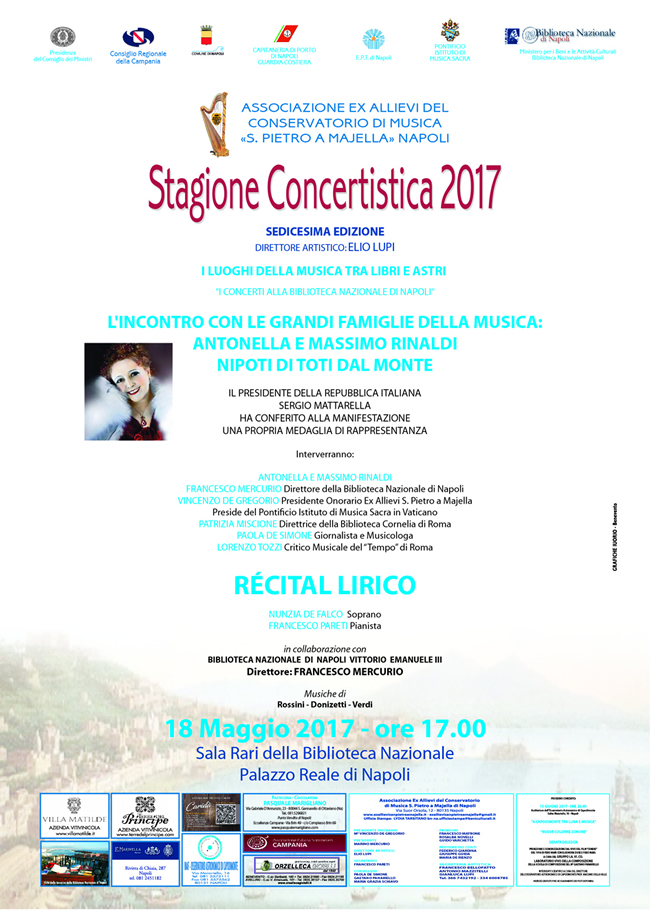 Giovedì 18 maggio alle ore 17.00 nella Sala Rari della Biblioteca Nazionale di Napoli a Palazzo Reale, inaugurazione della XVI stagione concertistica dell'Associazione ex allievi del Conservatorio di Musica "S. Pietro a Majella", organizzata dal suo Direttore artistico M° Elio Lupi.