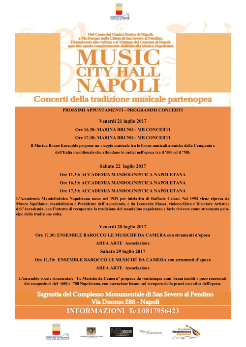 Una Music City Hall in pieno centro antico: a via Duomo, la via dei Musei - se ne contano ben sette - allestita nel Complesso Monumentale di San Severo al Pendino già sede di esposizioni d'arte, che riaprirà per questa nuova iniziativa la sua ampia e bella Sacrestia. Il lavoro condotto in questi mesi ha avuto un duplice obiettivo: turistico, per rispondere ad una precisa richiesta degli operatori del settore e dei viaggiatori che affollano sempre più la nostra città, di ascoltare la musica tradizionale napoletana in orari diurni; culturale e sociale, per restituire alla città e a i suoi cittadini uno spazio del patrimonio storico-artistico rinnovato nelle sue funzioni. La Sacrestia della Chiesa di San Severo al Pendino si aggiunge agli altri spazi per la cultura recentemente riaperti: dallo Spazio Comunale Piazza Forcella allo Spazio bambini Annalisa Durante ancora a Forcella, alla sala delle Colonne ed al Succorpo vanvitelliano alla Real Casa Santa dell'Annunziata. La programmazione musicale in Sacrestia partirà da venerdì 2 giugno e sabato 3 giugno con spettacoli alle 11.30, alle 16.30 e alle 17.30 per proseguire sperimentalmente fino alla fine di luglio. Il progetto Music City Hall Napoli vuole essere, nelle sue arie date, un viaggio nella musica napoletana che parte dal XVI secolo fino ad arrivare ai grandi cantautori del Novecento, offrendo una panoramica su quell'immenso e straordinario patrimonio culturale formatosi nel corso dei secoli all'ombra del Vesuvio, che ancora oggi è amato e apprezzato in ogni latitudine. Dalle villanelle del Cinquecento alla musica del Novecento, passando per quella barocca e per l'arte della posteggia, l'offerta culturale sarà di altissimo livello, con un vasto programma di concerti affidati tramite manifestazione di interesse a evidenza pubblica all'Accademia Mandolinistica Napoletana, all'associazione "Arte Area", all'associazione culturale "MB Concerti" e all'associazione "Musicapodimonte" che hanno lavorato insieme al calendario e al programma. Per informazioni e/o prenotazioni: Ida Esposito, mobile: 334.6551802 e-mail info@accademiamandolinisticanapoletana.com |