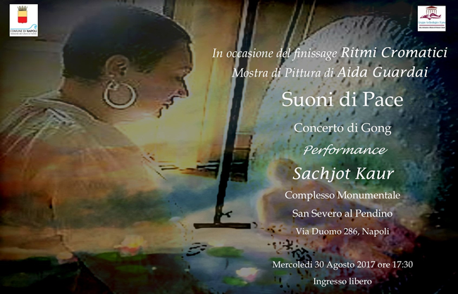 In occasione del finissage della la mostra "RITMI CROMATICI" dell'Artista Aida Guardai, Mercoledì 30 agosto, alle ore 17,30 presso il Complesso Monumentale di San Severo al Pendino, in Napoli alla via Duomo n. 286, si terrà "SUONI DI PACE", concerto di Gong, campane tibetane ed altri strumenti ancestrali, eseguito da Sachjot Kaur - Antonella Notturno.