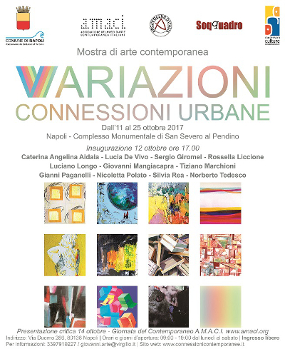 Variazioni è una collettiva che raggruppa artisti diversi fra loro per condurre una riflessione sulla valenza dell'arte contemporanea nel nostro Paese. Napoli è scelta come luogo di bellezza, una città che offre nel suo stesso esistere una forte espressività artistica, uno spazio urbano che possiede i passaggi e paesaggi che permettono, attraverso continue variazioni, il connettersi dell'arte contemporanea. Ciascun artista è in grado di esprimere una CONNESSIONE di arte contemporanea, per raccogliere e presentare quel legame che da sempre ha affascinato tutti gli artisti che hanno visto, letto e vissuto questa città metropolitana del sud del mediterraneo. Le luci, le forme, i colori caldi e pieni di energia vulcanica hanno lasciato un pensiero, un ricordo una traccia di esperienza da essere interpretati in quei paesaggi urbani metropolitani.