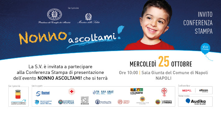 Il 29 ottobre il capoluogo partenopeo ospita per la prima volta la Campagna nazionale per i controlli gratuiti dell'udito "Nonno Ascoltami", patrocinata dal Comune di Napoli - Assessorato al Welfare, dalla Presidenza del Consiglio e dal Ministero della Salute e organizzata con il supporto dell'OMS (Organizzazione mondiale della Sanità). L'evento si svolgerà domenica 29 ottobre, dalle ore 10 alle 20, in Piazza del Plebiscito (ansa San Carlo). L'evento sarà presentato alla stampa mercoledì 25 ottobre, ore 10.00 presso la Sala Giunta di Palazzo San Giacomo. Interverranno: - Roberta Gaeta, assessore Politiche Sociali, Comune di Napoli - prof. Umberto Barillari, direttore Clinica Audiologia e Foniatria "Università della Campania L. Vanvitelli" - prof. Ettore Cassandro, direttore Clinica Otorinolaringoiatrica "Università degli Studi di Salerno" - dott. Antonio Della Volpe, responsabile U.O.S.D. di Chirurgia Protesica della Sordità "Ospedale Pediatrico Santobono-Pausilipon" Napoli - prof. Nicola Ferrara, direttore della Scuola di Specializzazione in Geriatria "Università Federico II" Napoli - prof. Maurizio Iengo, direttore Clinica Otorinolaringoiatrica "Università Federico II" Napoli - prof. Carlo Antonio Leone, direttore UOC Otorinolaringoiatria e Chirurgia Cervico-Facciale "Azienda Ospedaliera Specialistica dei Colli" Monaldi-Cotugno - prof. Elio Marciano, direttore Cattedra di Audiologia e Foniatria "Università Federico II" Napoli - prof. Gaetano Motta, direttore ORL "Università della Campania L. Vanvitelli" - Claudio D'Amario, sub commissario per la Sanità - Regione Campania - Mauro Menzietti, presidente onorario e fondatore di "Nonno Ascoltami!"; - Salvatore Regalbuto, partner tecnico. "Nonno Ascoltami!", che quest'anno coinvolge 37 piazze, 16 regioni con un bacino di utenza di circa 10 milioni di cittadini in tutta Italia, offre l'opportunità di effettuare controlli gratuiti dell'udito nelle tende messe a disposizione da Croce Rossa. Prendendo spunto dalla festa dei nonni, la manifestazione porterà in piazza tutta la famiglia, per una giornata di giochi, sport e divertimento per grandi e piccini. Tra le iniziative collaterali, il "Muro del nonno", esposizione di elaborati artistici sul tema rapporto nonno-nipote. "Nonno ascoltami!", che oggi rappresenta l'evento più importante dell'omonima associazione, è supportato da altre numerose campagne di prevenzione e sensibilizzazione contro i disturbi uditivi, organizzate in tutta Italia. |
