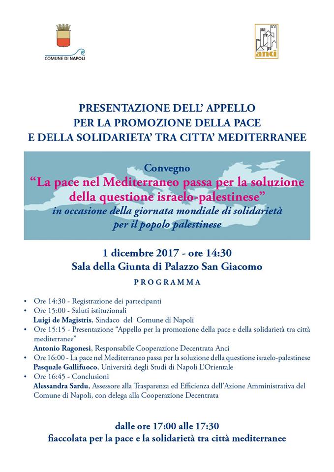 L'ANCI sceglie Napoli per lanciare l'appello ai Sindaci per la promozione della pace e della solidarietà tra città mediterranee. L'iniziativa viene promossa il 1 dicembre  alle ore 14,30 presso la sala della Giunta di Palazzo San Giacomo, in occasione della giornata mondiale di solidarietà per il popolo palestinese. Saranno presenti:  Luigi de Magistris, sindaco del Comune di Napoli; Antonio Ragonesi, responsabile Cooperazione Decentrata ANCI; Pasquale Gallifuoco, Università degli studi di Napoli L'Orientale; Alessandra Sardu, assessore alla trasparenza con delega alla cooperazione decentrata del Comune di Napoli.