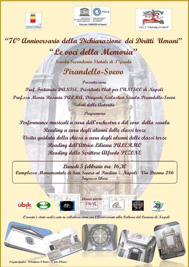 Lunedì 5 febbraio 2018, alle ore 16,30, nel Complesso Monumentale di San Severo al Pendino, in Via Duomo 286, il Club per l'UNESCO di Napoli e la Scuola Secondaria di primo grado Pirandello Svevo, in collaborazione con l’Assessorato alla Cultura e Turismo del Comune di Napoli, celebreranno il 70° Anniversario della Dichiarazione dei Diritti Umani, e la Giornata della Memoria con l'evento "Le voci della memoria: performance a cura dell'Orchestra e del Coro della scuola, reading degli alunni e degli ospiti Liliana Palermo e Alfredo Pezone,visita guidata e storia della Chiesa illustrata dagli alunni. Introducono la manifestazione la dirigente Scolastica Maria Rosaria Palma e il prof. Fortunato Danise,Presidente del Club per l’UNESCO di Napoli
