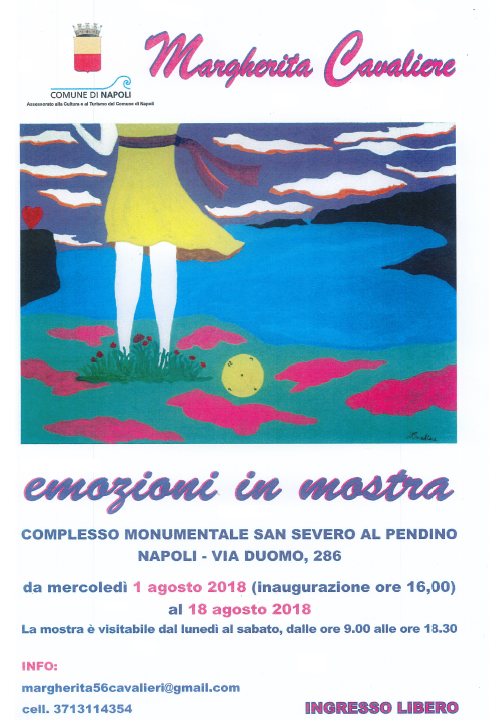 La pittrice napoletana Margherita Cavaliere presenta in via Duomo, nella sala di San Severo al Pendino, una significativa esposizione delle sue opere, testimonianza di un impegno artistico che da anni si rivolge all’espressione ed alla condivisione di emozioni, di stati d’animo, attraverso le immagini e i colori.