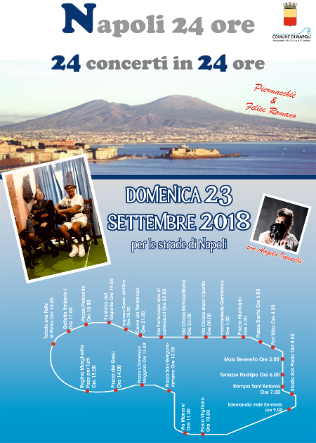 24 concerti in 24 ore in altrettanti luoghi della città per riaffermare una delle vocazioni di Napoli: città di musica per gli artisti e i suoi abitanti. Ma anche per dimostrare come Napoli sia una città sicura in tutte le ore del giorno.