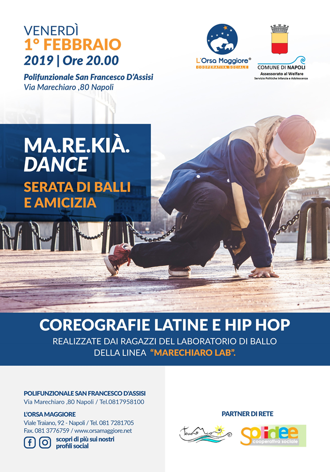 Il giorno 1 febbraio alle ore 20 ,00 l' Assessorato al Welfare organizza nel Centro Polifunzionale San Francesco d' Assisi, di via Marechiaro 80, l'evento conclusivo del percorso Marekià Dance, iniziato a novembre 2018,  nell'ambito del progetto Adolescenti, realizzato dal Servizio Politiche Infanzia e Adolescenza e la Coooperativa orsa Maggiore al quale parteciperanno i ragazzi, che hanno organizzato per l'occasione la performarce finale, e le loro famiglie, con la presenza dell' Assessore Roberta Gaeta e della Dirigente del Servizio Barbara Trupiano.