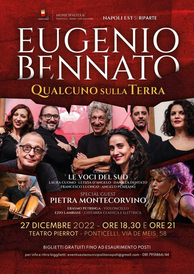 La Municipalità Barra-Ponticelli-San Giovanni a Teduccio ha concentrato le risorse affidate dall’Amministrazione Comunale per offrire alla cittadinanza un concerto di grande qualità di Eugenio Bennato con Pietra Montecorvino e “Le Voci del Sud”, il giorno 27 dicembre 2022, con doppia esibizione alle ore 18.30 e alle ore 21.00, presso il Teatro Pierrot sito in Via A. C. De Meis 58, Ponticelli.