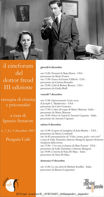 La III edizione de "Il cineforum del dottor Freud", rassegna sui rapporti tra cinema e psicoanalisi, curata da Ignazio Senatore, critico cinematografico e psichiatra dell'Università Federico II di Napoli, verte su questi gustosi ed appassionanti interrogativi. La kermesse si svolgerà dal 6 al 9 dicembre al Penguin Cafè di Via S. Lucia 88, a Napoli e personalità del calibro di Mario Martone, Antonio Capuano, Renato Carpentieri, Nina Di Majo, Cristina Donadio, Mario Franco, Giulio Baffi, Marco Lombardi, Carlo Cremona, Lidia Tarantini e Simone Mangoni si alterneranno per presentare e commentare le pellicole selezionate.