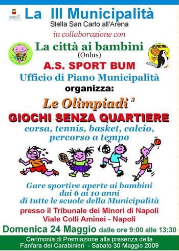 Nell'ambito delle iniziative "Vivi il Quartiere", la Municipalità 3 Stella San Carlo all'Arena, in collaborazione con le Associazioni del quartiere, promuove la manifestazione sportiva, " Le Olimpiadi Giochi senza Quartiere" corsa,tennis,basket, calcio, svolta dai bambini di alcune scuole della Municipalità il giorno 24 maggio p.v. dalle ore 9.00 alle 13.30 presso il Tribunale dei Minori, in viale Colli Aminei, il giorno 30 maggio p.v. dalle ore 9.30 alle 14.00 presso il Parco del Poggio in Viale del Poggio dove si svolgerà la cerimonia di premiazione con la partecipazione della Fanfara dei Carabinieri.