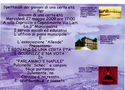 La Municipalità 3 Stella San Carlo all'Arena ha organizzato in collaborazione con l'associazione "Allende" uno spettacolo teatrale per i giovani di una certa età presso la sede di Villa Capriccio sita in via Lieti a Capodimonte 97 per il giorno 27/05/2009.